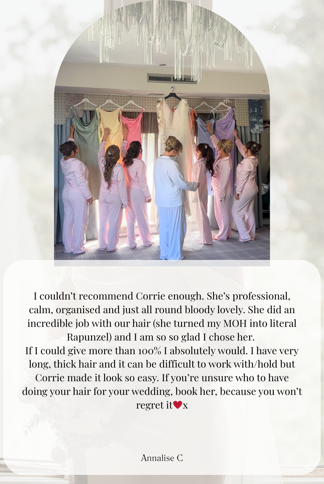 Your bridal hair is a statement of your style and individuality, which is why I prioritise creating a look that makes you feel elevated, radiant, and completely at ease on your special day.