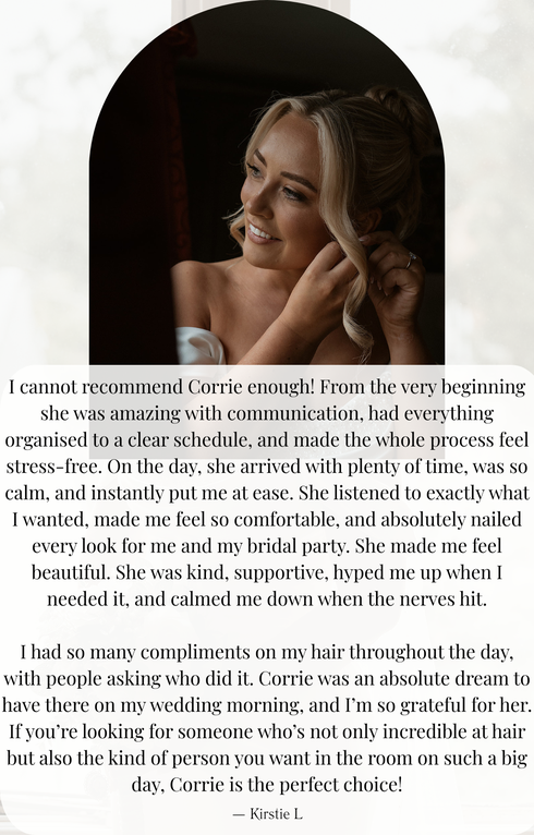 Your wedding day is all about feeling like the best version of yourself and I am here to help your vision come to life! Your wedding hair is a huge part of what makes you feel beautiful, confident and shows your individual personality, therefore it is my priority that you feel like you on your special day.